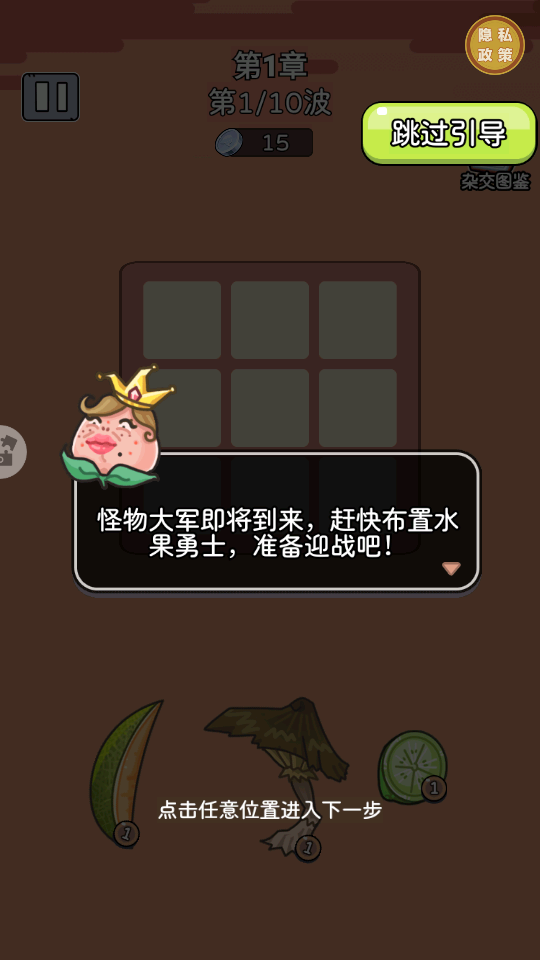 2、游戏引导提示【怪物大军即将到来,赶快布置水果勇士,准备迎战吧!】,点击任意位置进入下一步,开始布置防御。