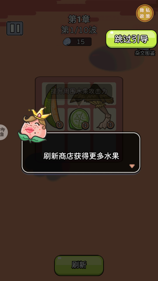 3、看到提示【刷新商店获得更多水果】,点击【刷新】按钮,获取更多水果勇士,增强防御实力,迎接怪物进攻。