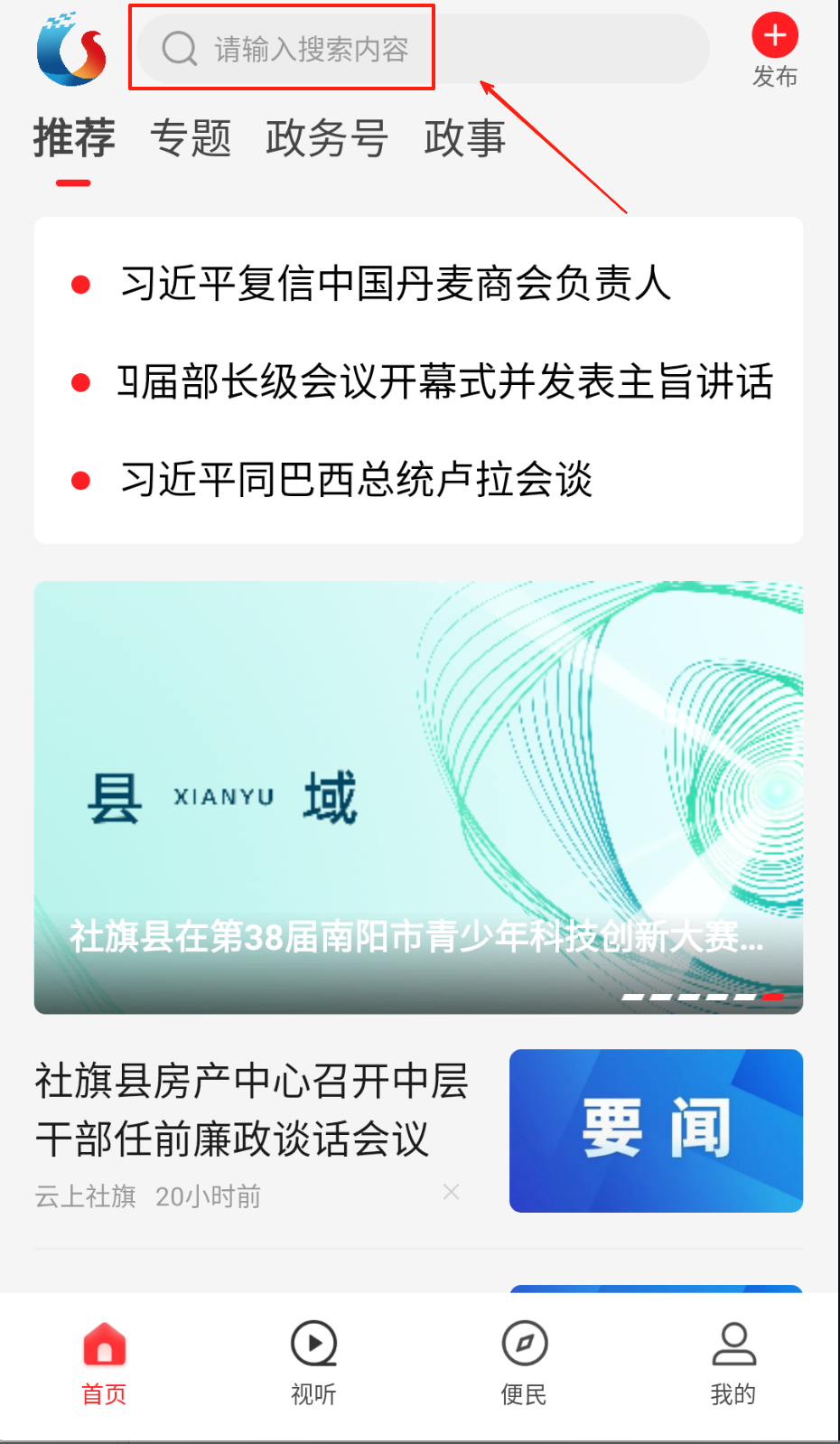 1、完成实名认证后进入主界面,顶部搜索栏可键入关键词直达所需服务模块,左侧导航栏划分新闻、视听、办事三大核心板块。