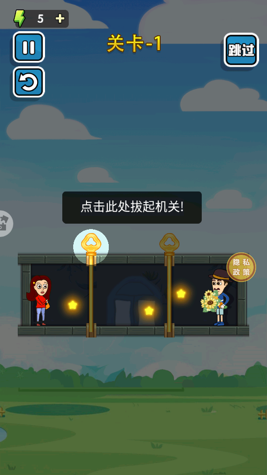 3、进入【关卡-1】界面,按照提示【点击此处拔起机关】进行操作,开始关卡挑战。
