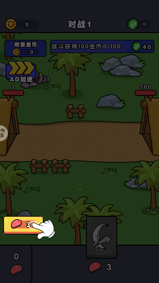 3、战斗中,按照提示操作,如拖动【肉片】布置单位,利用【AD加速】等功能,完成【收集金币】任务,推进游戏进展。