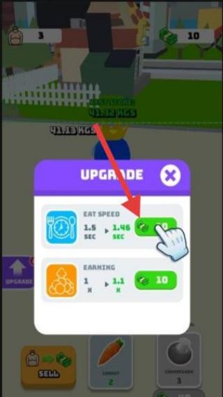 2、点击“UPGRADE”界面中的“EATSPEED”升级按钮,提升进食速度属性,花费相应资源。