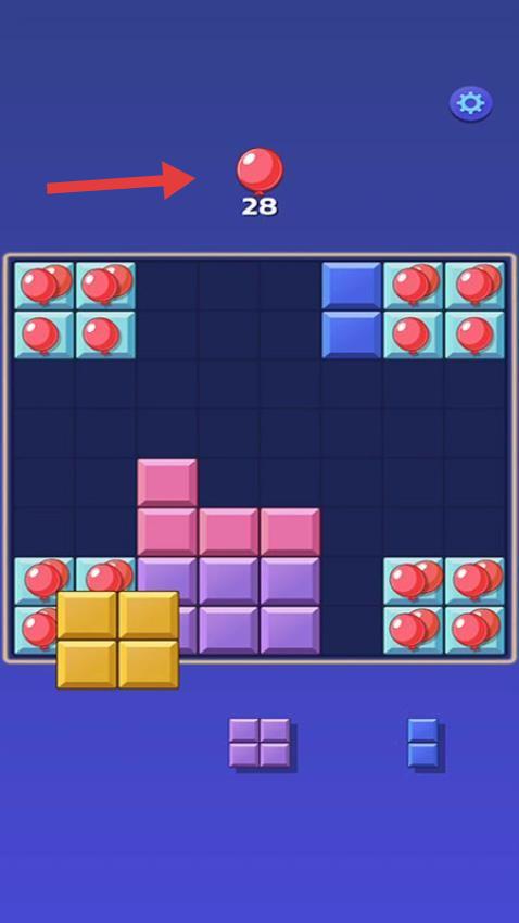 1、观察界面布局,合理摆放方块消除,快速减少【28】个红色球,注意方块组合策略。