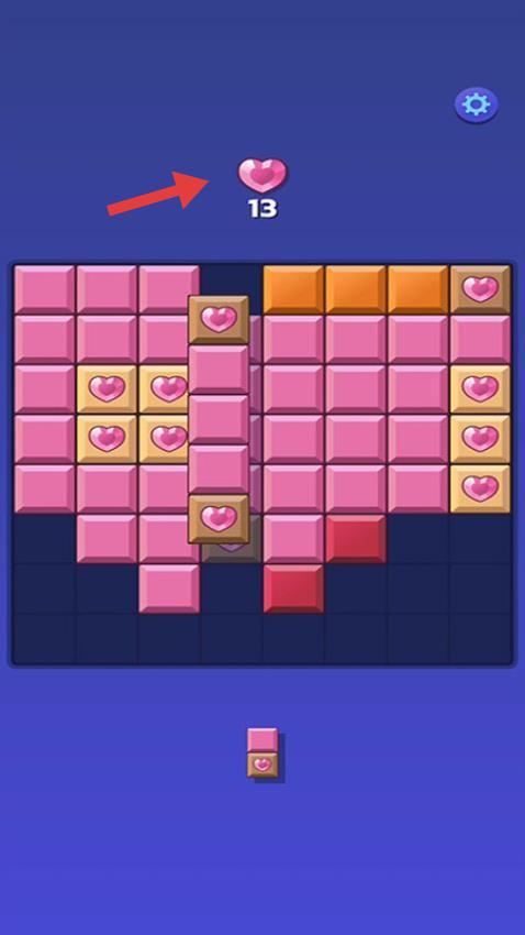 3、专注爱心消除,规划方块放置,收集【13】个爱心,确保每步操作都向目标靠近,完成关卡任务。