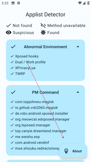 应用列表检测器是一款针对安卓设备的应用安全检测工具,主要用于扫描识别magisk管理器等可疑程序,帮助用户排查隐藏的木马病毒及环境异常,为手机系统安全提供专业级防护。它通过root权限与框架支持,实现对应用列表的深度检测,不仅能精准定位风险应用,还能针对检测到的异常提供详细修复指引,适用于追求设备安全的高阶用户,助力构建更纯净的手机使用环境。