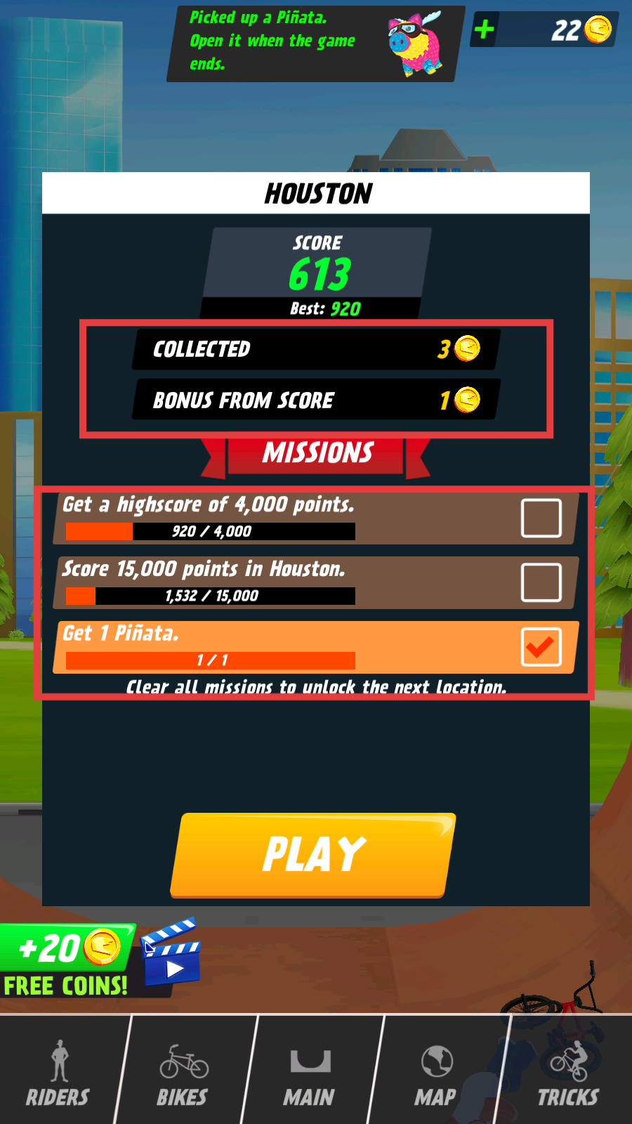 3、关注【MISSIONS(任务)】,完成任务可解锁新地点。例如【Get1Piñata(获得1个皮纳塔)】已完成,继续推进其他任务。