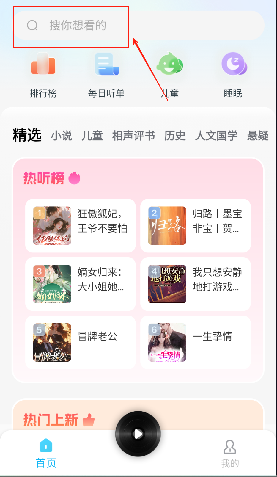 1、在顶部搜索栏输入书名或演播者,智能联想功能可快速定位目标作品,点击收藏按钮加入个人书架。