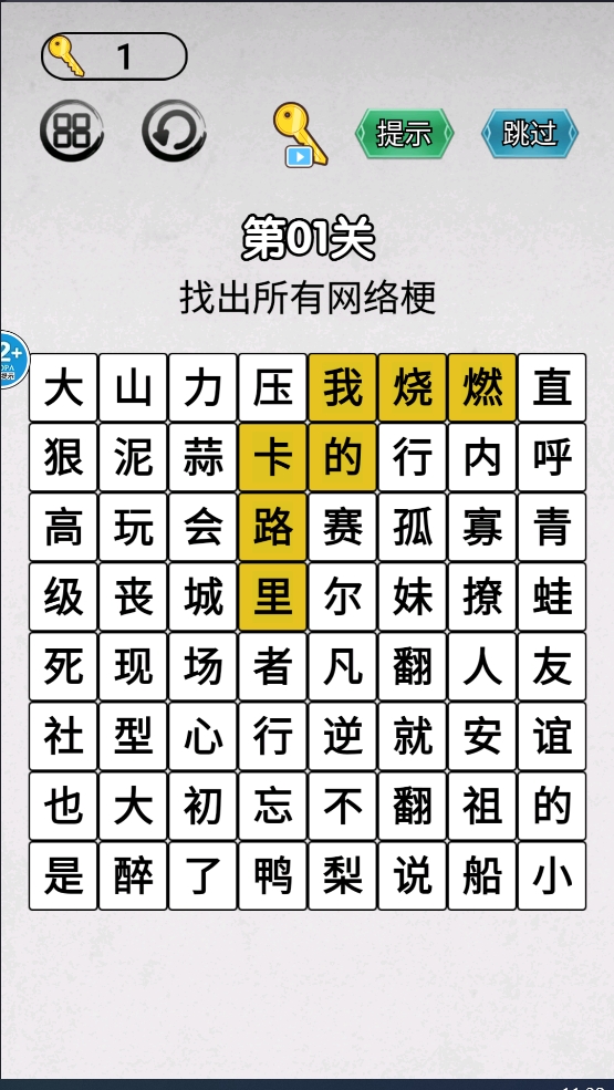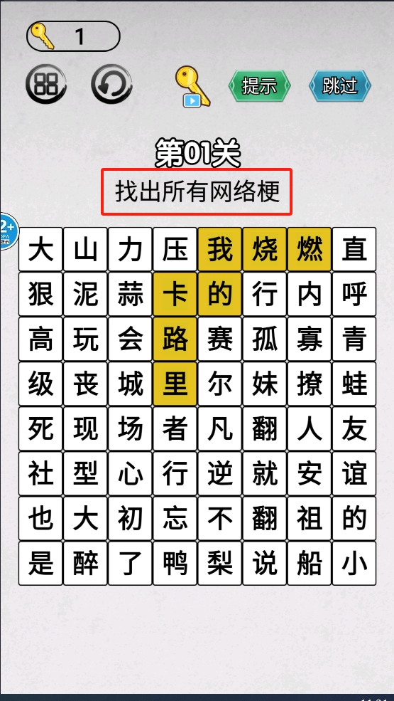 3、最后,在关卡列表中,选择“第01关”并找出所有网络梗以完成关卡挑战。