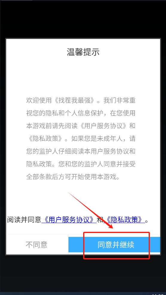 1、首先,阅读并同意《用户服务协议》和《隐私政策》后,点击“同意并继续”按钮以进入游戏。