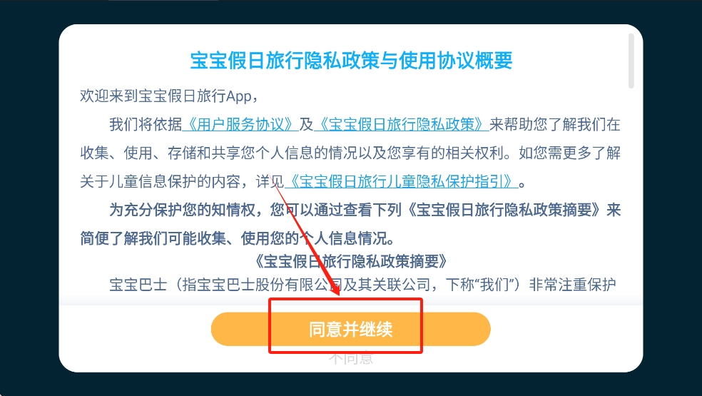 1、首先,阅读并同意“宝宝假日旅行”隐私政策,点击“同意并继续”按钮以接受条款。