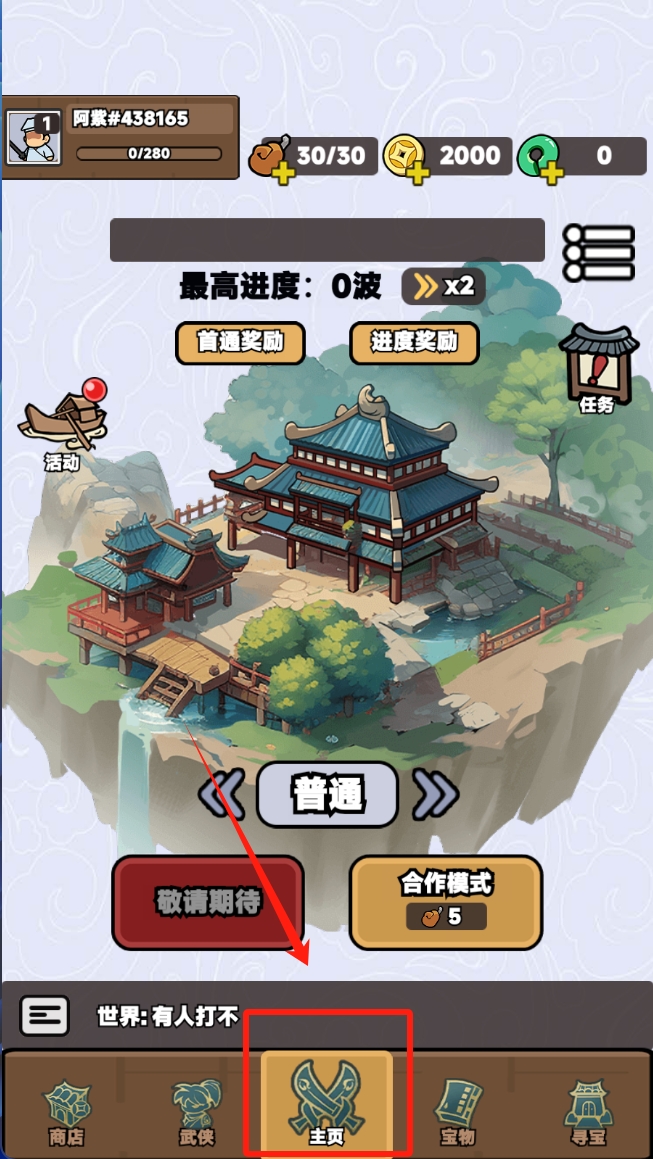 2、在武侠界面,点击“主页”按钮返回主菜单。主菜单是游戏的核心操作区域,可以进行多种操作。