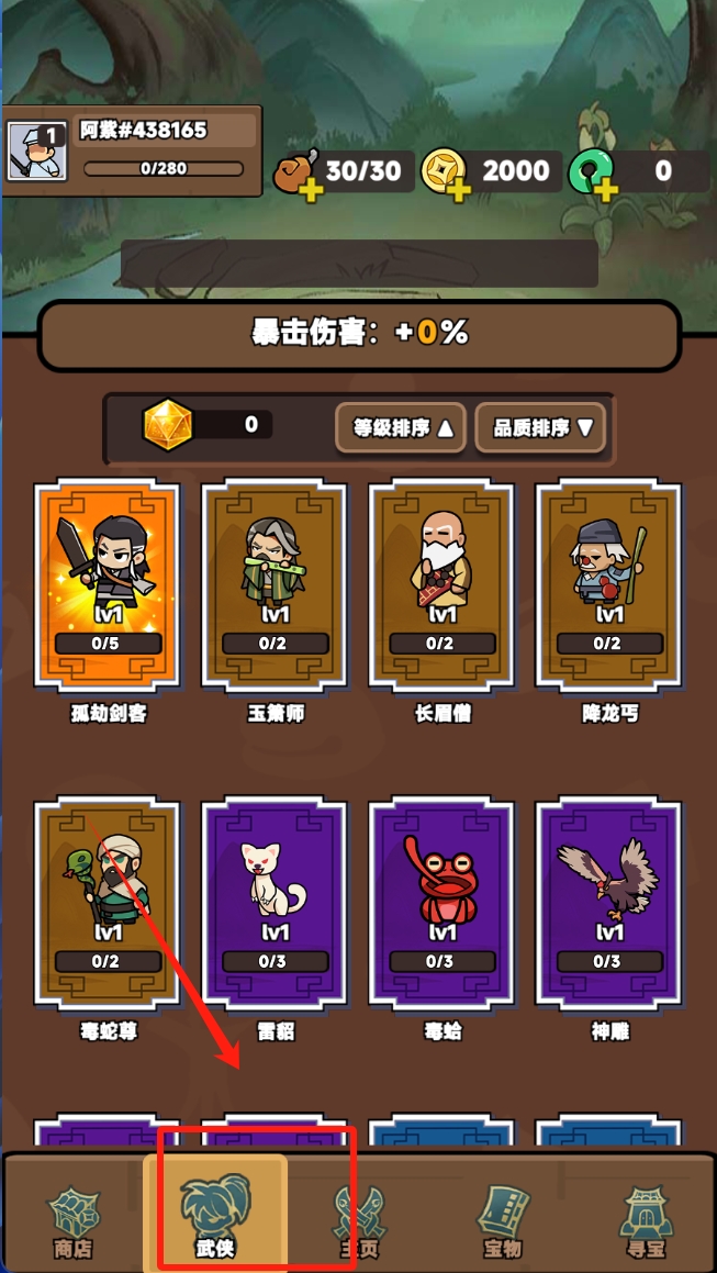 1、进入主页界面,点击“武侠”按钮查看角色信息。角色信息界面可以帮助你了解当前角色的等级和属性。