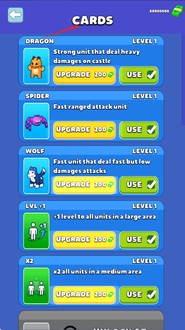 2、在CARDS界面选择卡牌进行升级。点击CARDS按钮,选择需要的卡牌进行升级,提升卡牌战斗力,为战斗做好准备。
