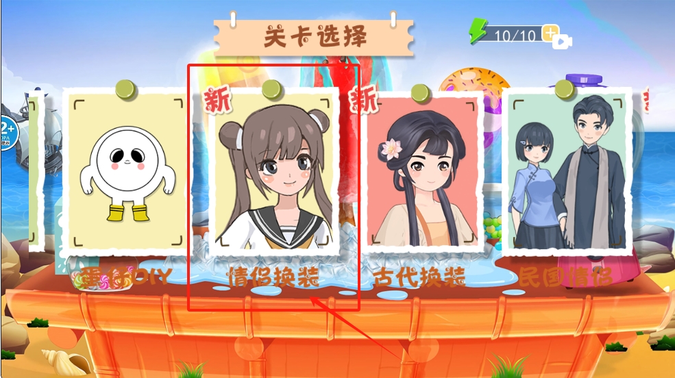 3、然后,在关卡选择界面,选择一个关卡并点击进入。例如选择”情侣换装“模式。