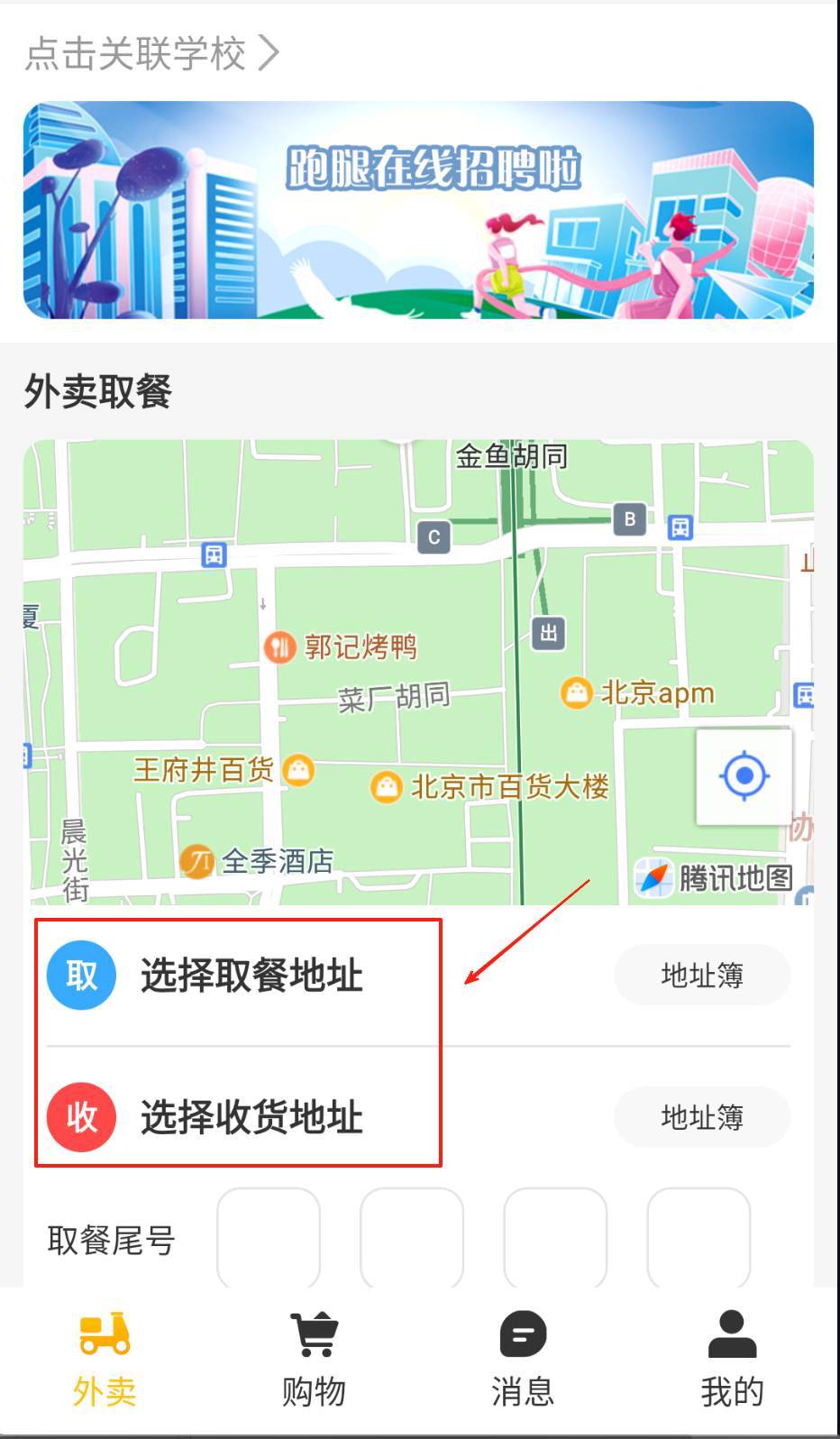 1、可以先登录软件,点击关联学校,根据当前需求选择外卖代取或快递收取等具体业务模块。
