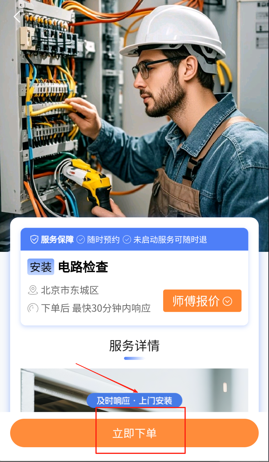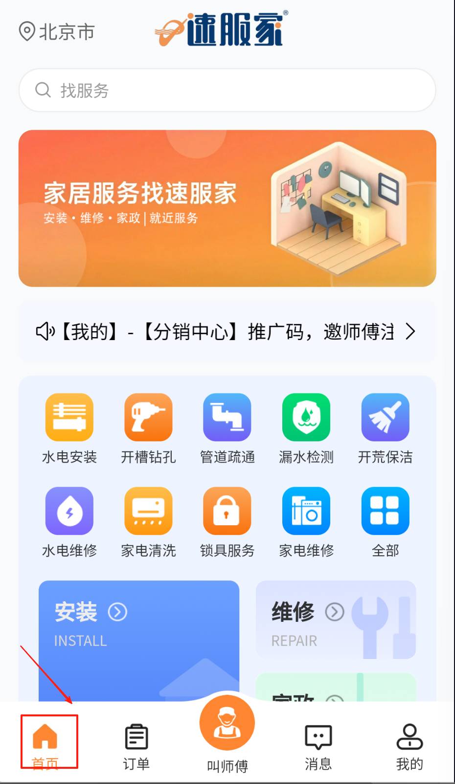 1、进入应用首页浏览家居服务分类,按需求筛选维修安装等具体项目类型。