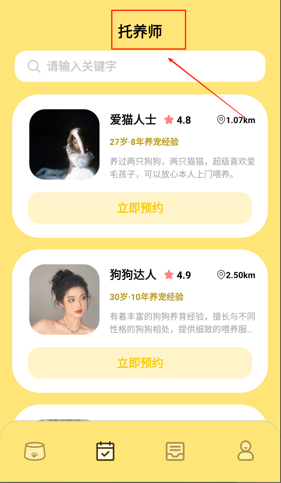 2、通过智能筛选系统匹配周边认证托养师,在线预约上门,喂养或短期寄养服务。