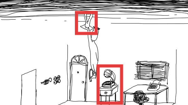 1、进入场景后,留意上方倒挂的人物,观察周围物品如【留声机】等,寻找解谜线索。