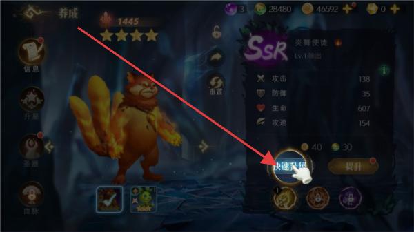 2、找到【快速升级】按钮提升角色等级增强实力。