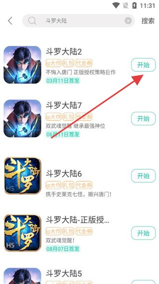 3、在搜索结果中,找到对应游戏如【斗罗大陆2】并点击【开始】游玩。