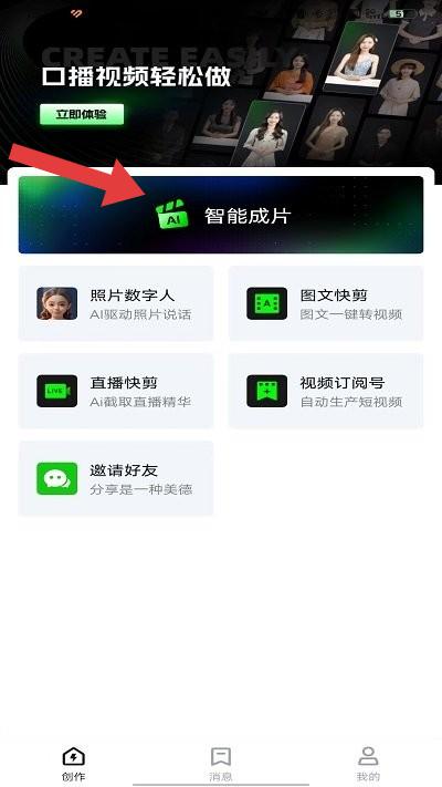 1、第一步,打开软件后,点击【智能成片】进行下一步。