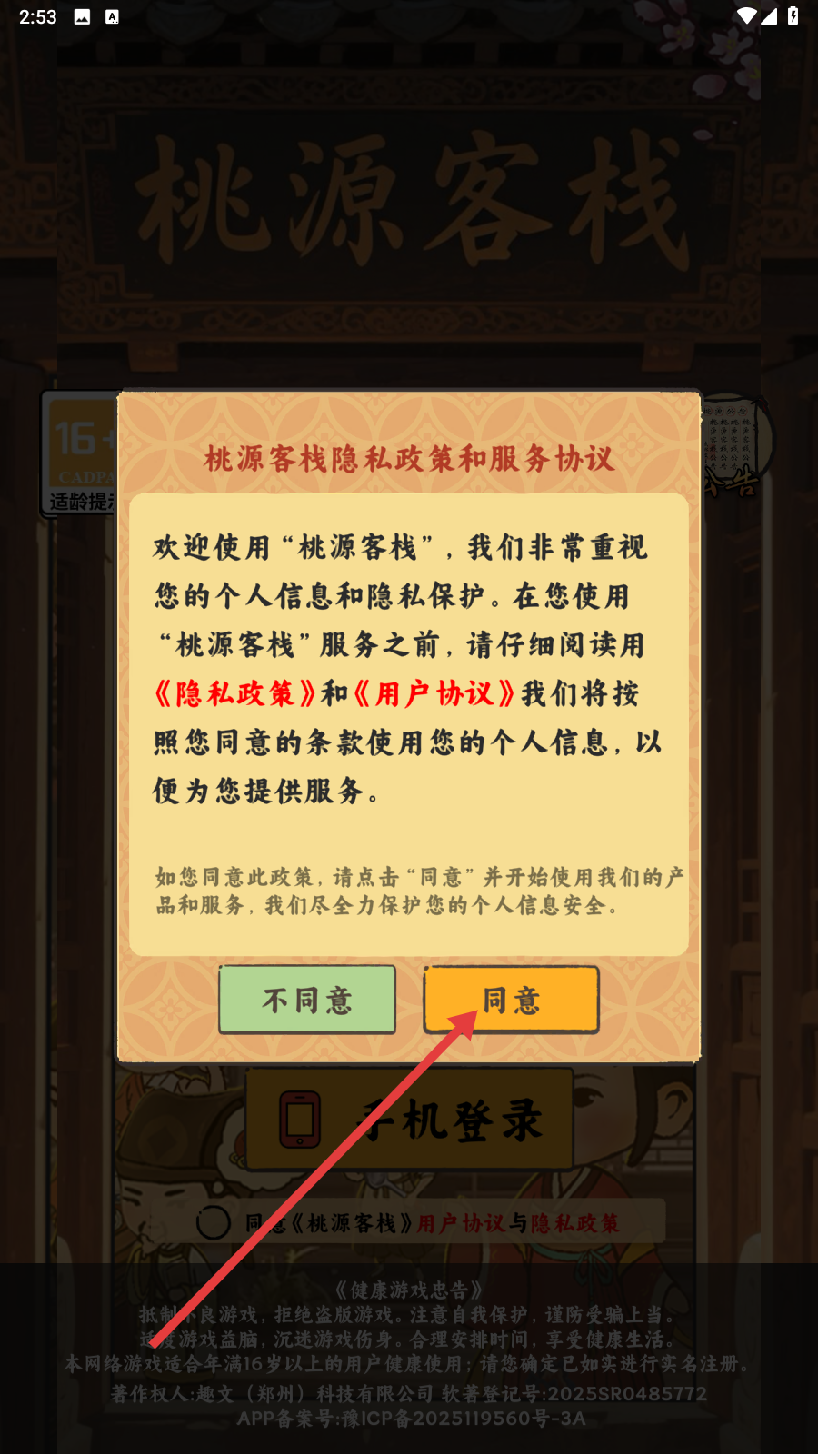 1、进入游戏,点击【同意】。