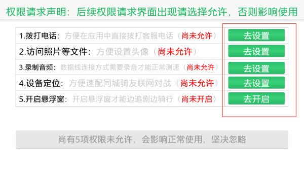 1、出现【权限请求】点击对应按钮设置确保使用。