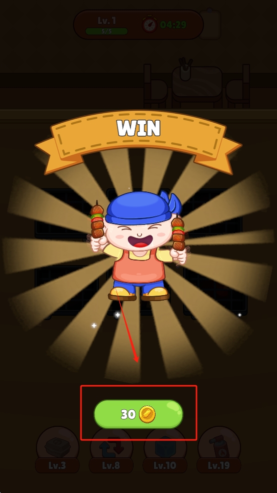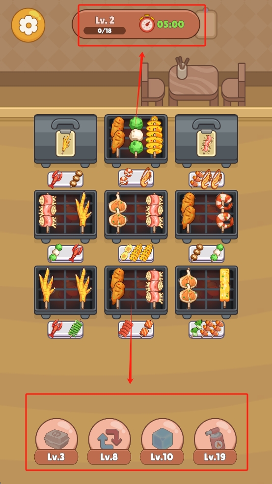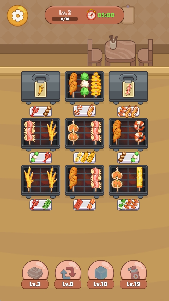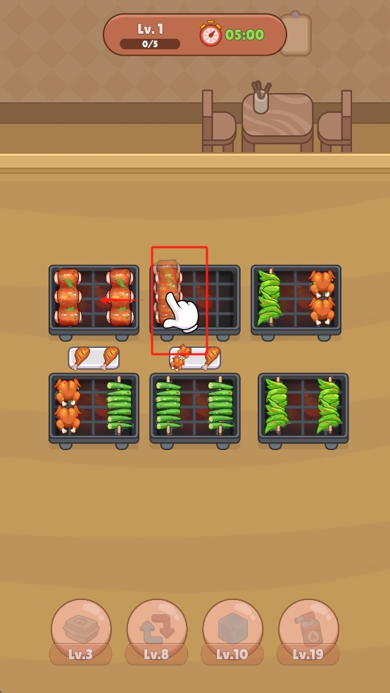 2、排序烤制食物。在游戏中,用户需要点击并拖动食物以排序烤制消除。