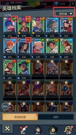 1、在【英雄档案】界面,可点击【依阶级】筛选英雄,方便管理与查看不同阶级英雄,合理规划培养。