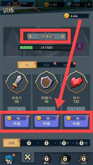 2、进入【训练】界面,通过【训练等级】下方的【升级】按钮,对攻击力、防御力、体力进行升级,提升英雄实力。