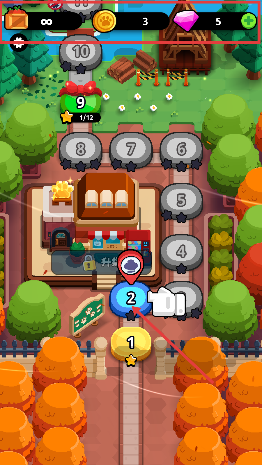 2、注意界面上方显示的金币、钻石等资源信息并进入下一关。