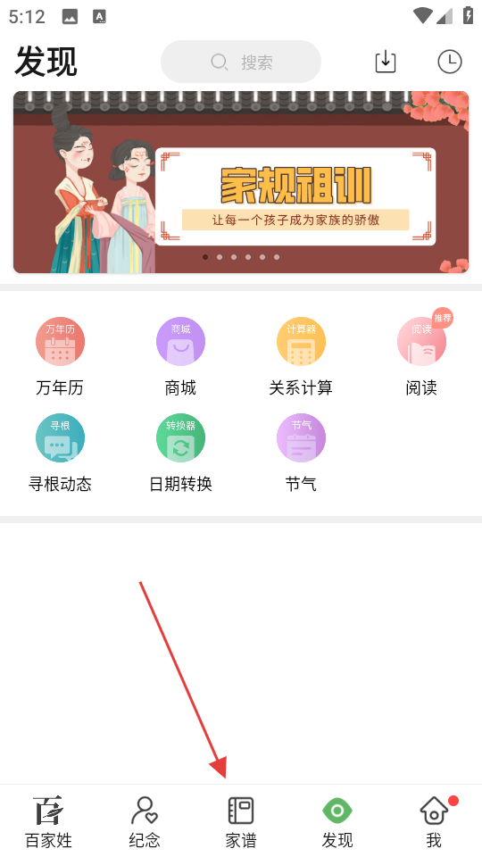 2、进入首页,点击底部【家谱】选项进入相关界面。