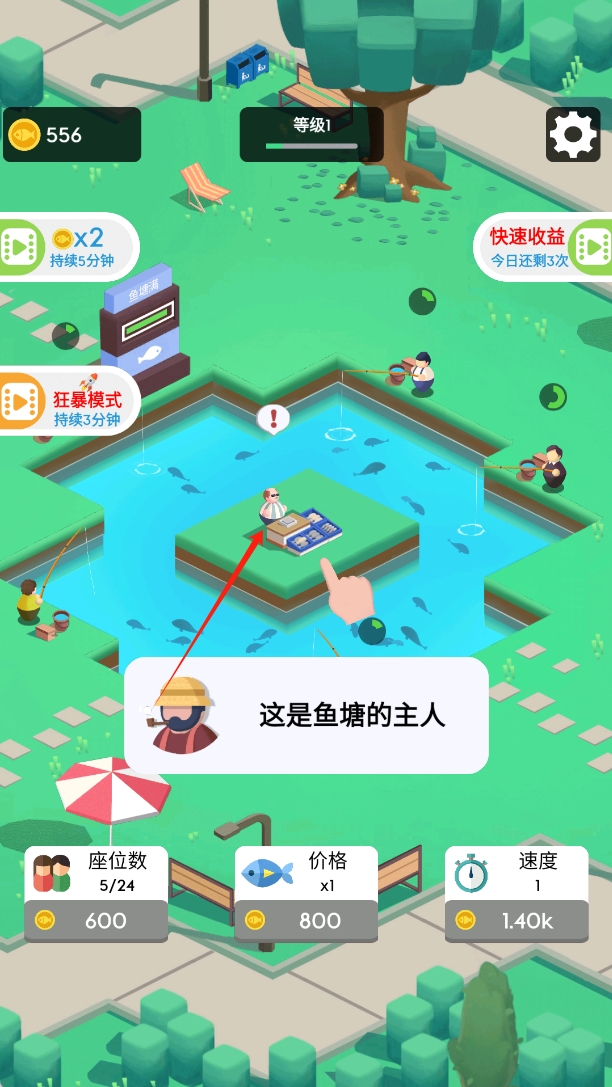 1、点击屏幕中的鱼塘主人,了解鱼塘基本信息,包括座位数、价格和速度等。