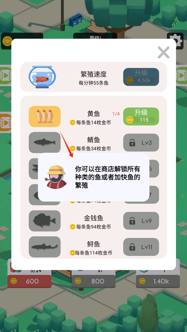 2、在商店界面,选择并解锁不同种类的鱼,增加鱼塘的多样性和收入来源。