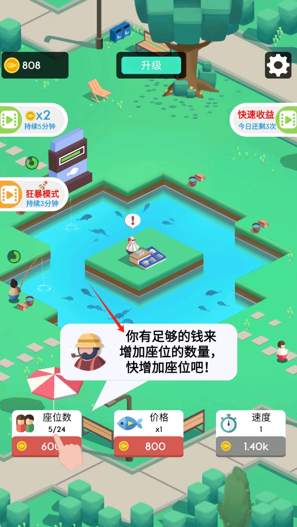 3、当金币充足时,点击增加座位数,提升鱼塘的接待能力,获取更多收益。