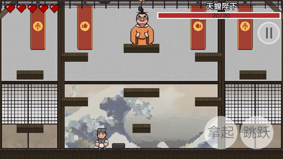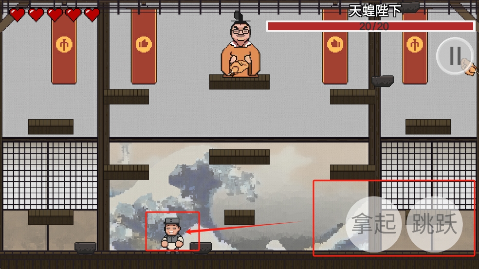 2、游戏操作,在游戏界面中,使用屏幕右侧的“拿起”和“跳跃”按钮来控制角色移动和操作。