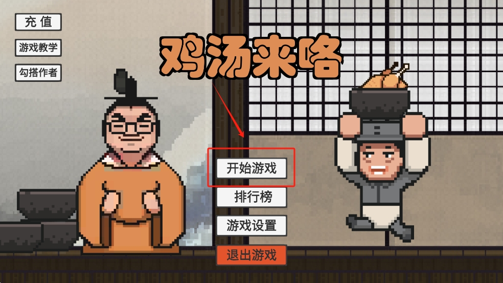 2、复古像素画风:采用经典8-bit风格设计,从角色到场景都充满怀旧感。鸡汤泼洒时的像素粒子效果,勾起童年游戏回忆。