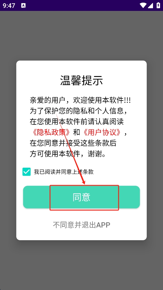 1、打开应用后,阅读并勾选“我已阅读并同意上述条款”,然后点击“同意”按钮以接受隐私政策和用户协议。