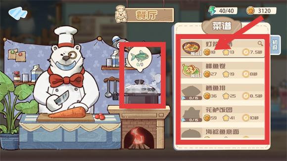 2、进入餐厅后查看右侧【菜谱】,根据需求准备食材进行烹饪,左侧显示食材获取进度。