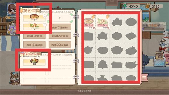 3、关注【特色菜单】与【兑点菜单】,通过店铺等级解锁特色菜单,利用兑点菜单兑换相应菜品。