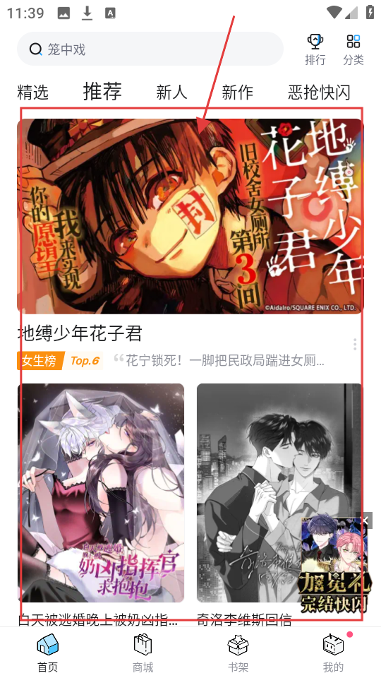 1、在推荐页找到喜欢的漫画比如【地缚少年花子君】就点进去哦,开启漫画阅读之旅呀。