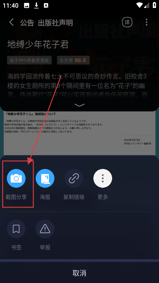 3、展开后选【截图分享】功能哦,这样就能把漫画画面分享给好友啦,超方便的呢。