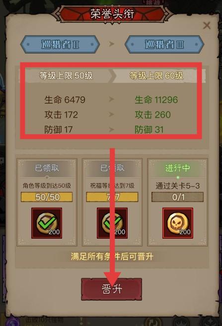 2、在【荣誉头衔】界面,满足条件后点击【晋升】,可提升生命、攻击、防御等属性。
