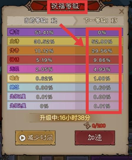 3、关注【祝福等级】界面中各品质概率,通过提升祝福等级优化战斗加成。
