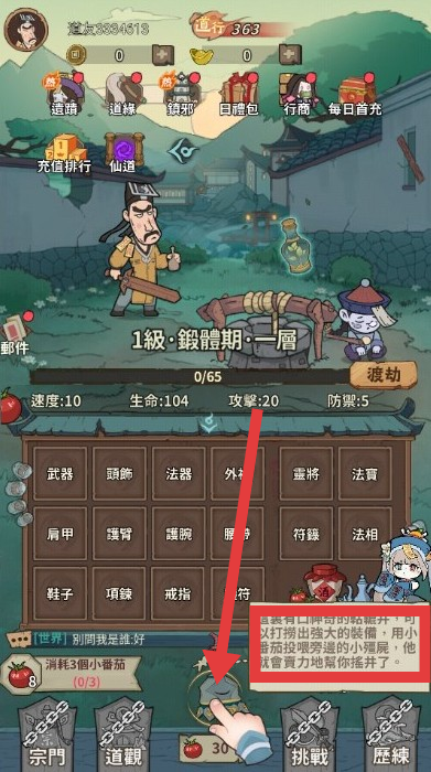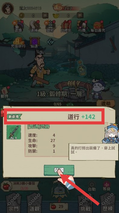 2、获得装备后点击【裝備】穿上新装备提升道行。