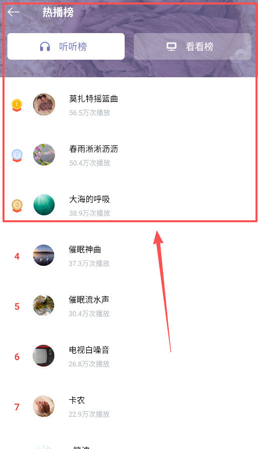 2、如果想找热门内容,就点“榜单”进入热播榜,看看“莫扎特摇篮曲”或“春雨淅淅沥沥”这些高播放量的选项。