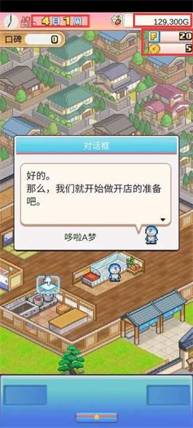 1、根据哆啦A梦提示,开始进行开店准备工作,留意界面上方资源数值(如129.300G)。