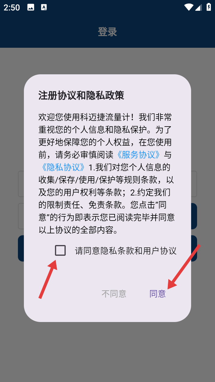 1、用户打开软件后,点击勾选方框后再点击【同意】即可进入登录界面。