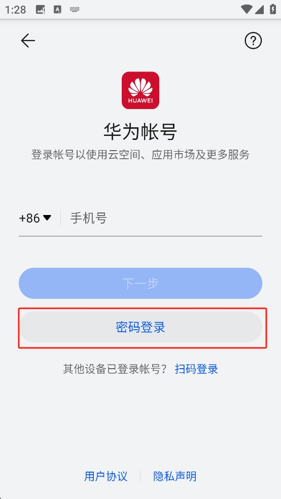 3、在华为账号登录页,可选择【密码登录】进行账号登录。