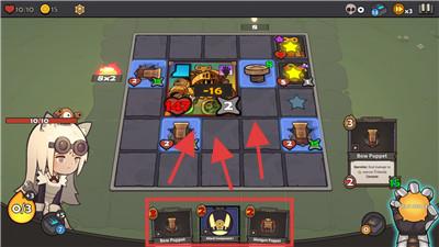 1、卡牌策略组合:利用俄罗斯方块机制拼合攻击方块,长条方块造成贯穿伤害。需根据敌人位置调整方块,三消触发特殊技能。